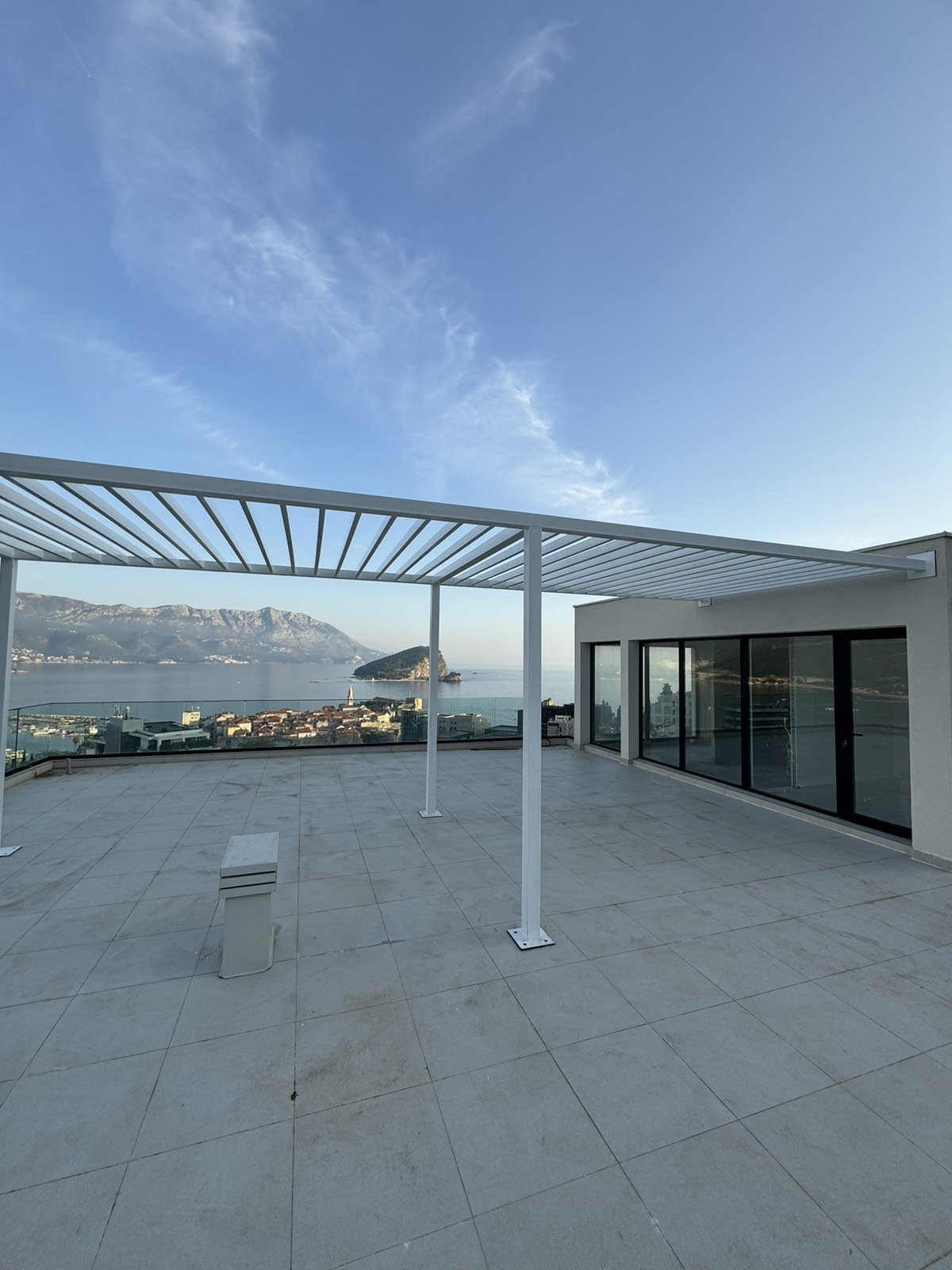 This penthouse has views from three sides of a building, with a total area of 125,84 m2, plus rooftop house with 12,48 m2, and 124,61 m2 of a rooftop terrace, that makes penthouse total size of 262,93 m2. Exceptional sea views can be experienced from terraces, living room, sauna, and one of the bedrooms. The other two bedrooms are oriented toward the hillside. The apartment contains two bathrooms and a shower space on the rooftop. The rooftop terrace is above the apartment and connected with a staircase leading to the sauna and rooftop entrance/exit. The big rooftop terrace features a jacuzzi, an open-door kitchen, a lounge space with a pergola, sunbathing area, and finally stunning views toward the sea and Budvas old town. The apartment is furnished.
