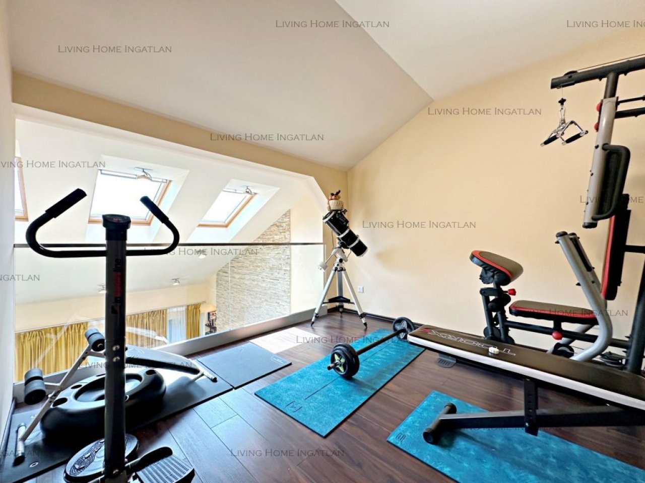 Upstairs: a spacious and unique staircase leads upstairs, where you will find three bedrooms and a bathroom with bathtub. The gallery room is currently furnished as a fitness room, where you can recharge and relax. One of the bedrooms has a 9 sqm balcony with beautiful views of the surrounding landscape and forest. The bathroom has a large built-in massage bathtub.