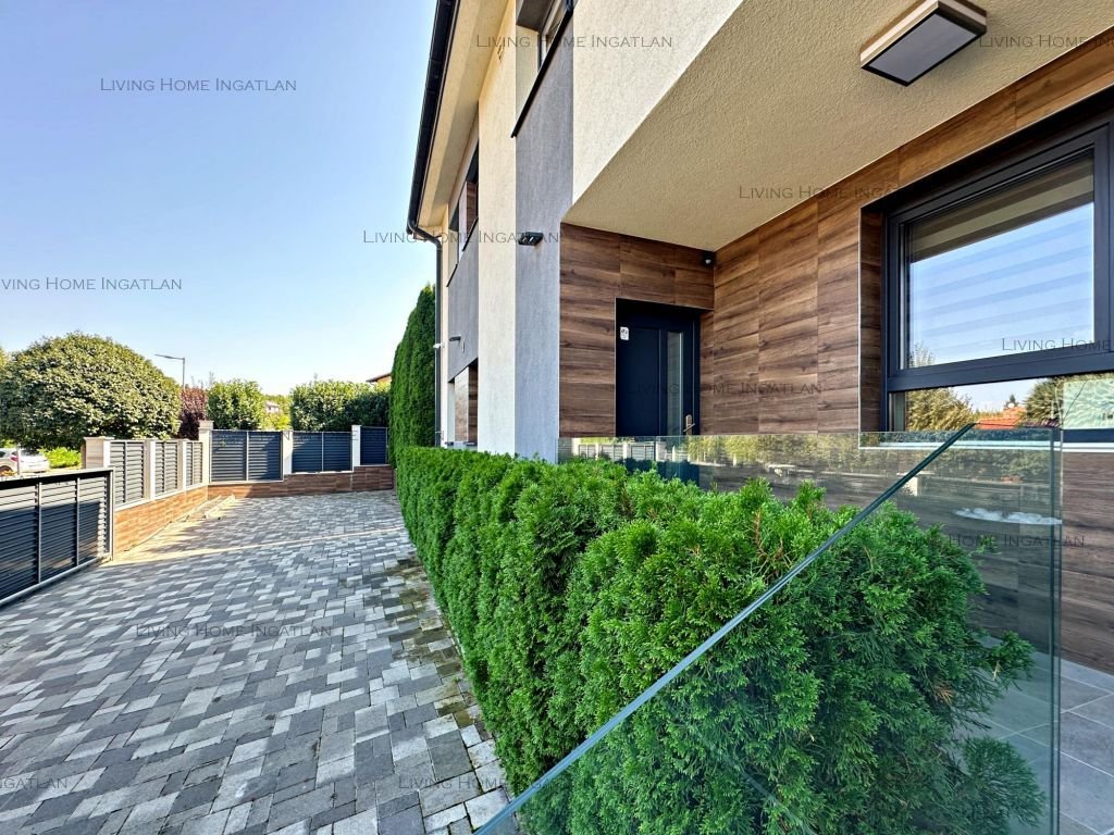 Panorámaliget is a modern new residential complex in Üröm, located near Budapest, at the foot of the mountains and offering beautiful panoramic views of the surrounding countryside. The semi-detached house is located in a quiet dead-end with no through traffic. The property has the feel of a completely detached family house, as the living area and the garden are completely separated, the common wall is double and soundproofed. The plot of 435 sqm is surrounded by ornamental trees, beautifully landscaped, and the irrigation is provided by an automatic irrigation system. Small children can play on the wooden playground with a slide and climbing frame in the middle of the garden, while adults can enjoy the 4-person sauna in a separate building or the jacuzzi on the terrace. Even larger groups can be comfortably accommodated in the seating area on the terrace. Through an automatic garage door, the garden can comfortably accommodate two vehicles in the paved, paved parking area.