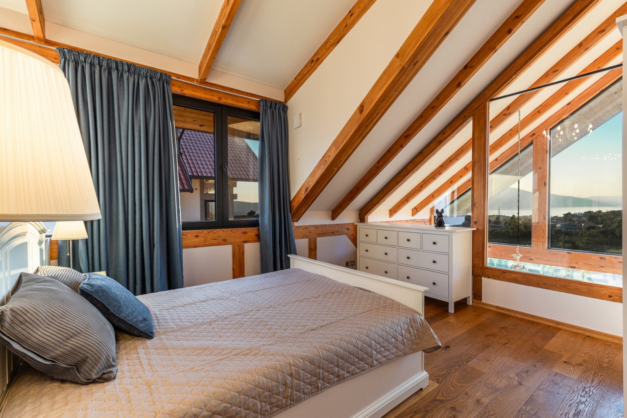 Contemporary Half-Timbered Home in Tivat Hill (2019) Elegant 230 m² residence featuring Siberian Larch timber framing and modern glass elements, combining sustainable design with practical comfort. The thoughtfully designed layout includes a large kitchen, spacious living room, 3 bedrooms, and 3 bathrooms with heated floors. The homes energy-efficient construction ensures warmth during winter months while reducing environmental impact. Set on a 150 m² plot, this property offers scenic views from both floors. The interior features quality Italian furniture and includes a flexible dressing room space that can be converted into an additional bedroom or home office as needed. The landscaped garden features an automatic irrigation system for effortless maintenance. Features: ·        Siberian Larch and glass construction ·        Smart security system with mobile app integration ·        Convertible dressing room ·        5-car parking area ·        Custom Italian furniture ·        Views from ground and first floor The propertys location in Tivat Hill presents opportunities for both family living and investment, with strong rental demand in the area.